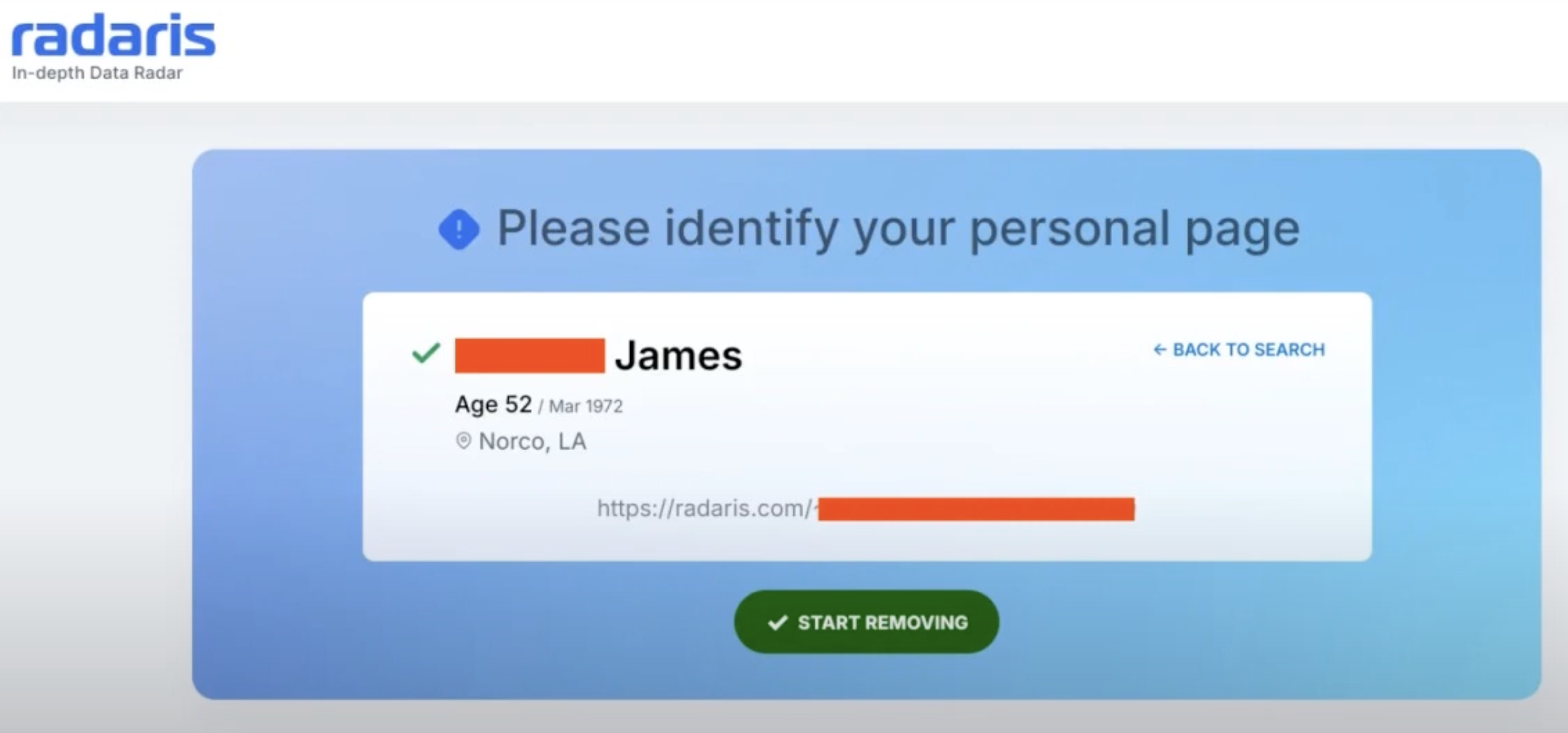 - Enter your name and location to find your Radaris listing.
