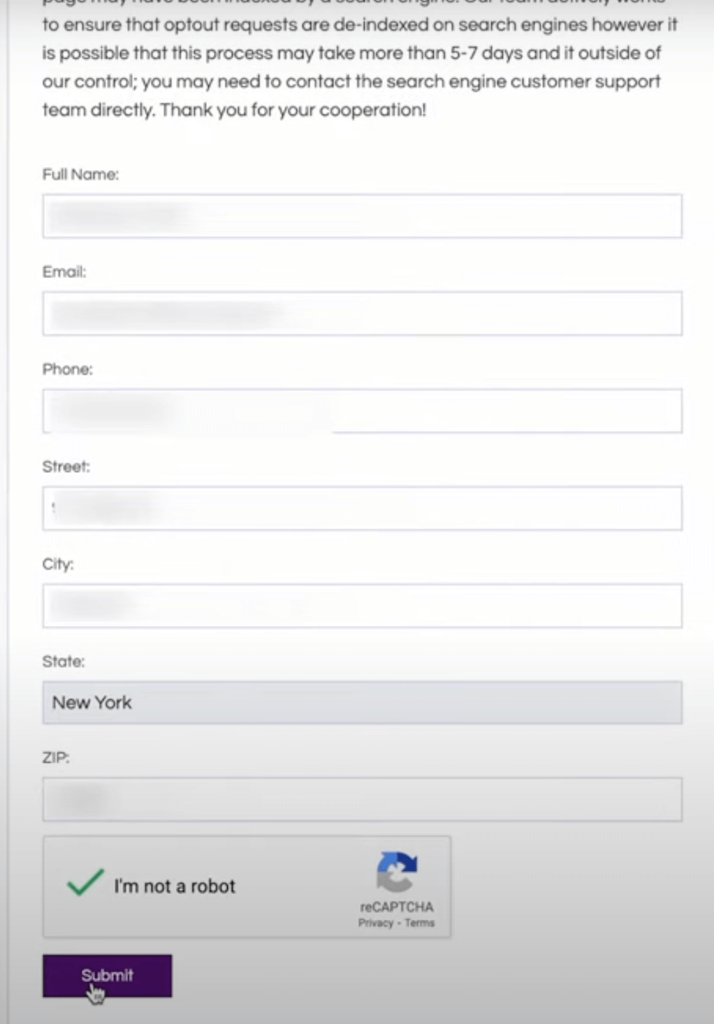 Enter your name, email, phone, street, city, state, and ZIP exactly as the listing shows, solve the CAPTCHA, and submit. You do not need to create an account. If you have multiple profiles, repeat the form for each one. Take a screenshot of the on-screen confirmation.